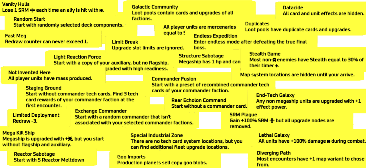 -Among other things these include endless mode, various randomized starts, all faction runs and lots of ways to make runs way easier or harder.